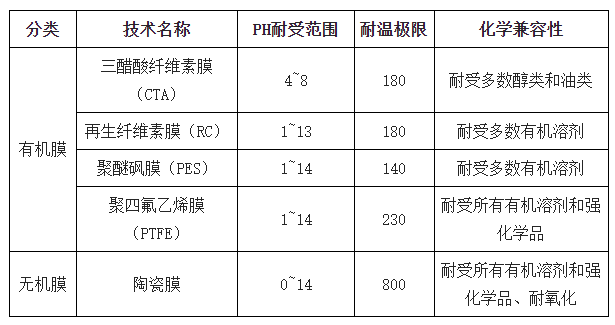 有機(jī)膜的和無(wú)機(jī)膜主要參數(shù)對(duì)比